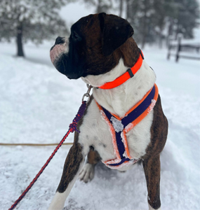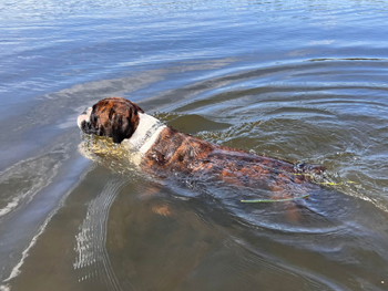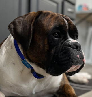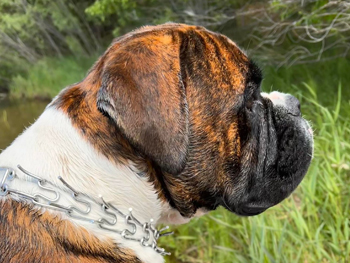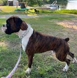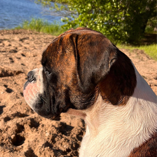 Sailor is a big fat head, half European Boxer. His sire was imported from Croatia. His mom is American. A Boxer is a Boxer, however, the euro dogs definitely have a little different drive and look to them. Sailor is a swimming machine and a big cuddle bug out of the water. We're very excited for the forward progress Sailor has brought to our breeding program.